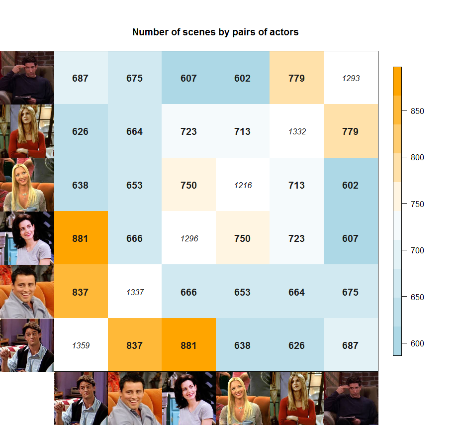 Prenons le cas de Chandler. Au total Chandler apparait dans 1359 scènes (la série contient 2857 scènes au total). Sur ces 1359 scènes, il en partage 837 avec Joey et 881 avec Monica (ce qui semble logique, Chandler étant très ami avec Joey et en couple avec Monica pendant une bonne partie de la série). Ensuite, Chandler partage 687 scènes avec Ross et seulement 626 avec Rachel et 638 avec Phoebe (donc environ 30% de scènes en moins). Si l'on recherche les "couples" d'acteurs ayant le moins de scènes ensemble, on trouve bien le duo Ross-Phoebe avec seulement 602 scènes ensemble et, de manière plus surprenante, il n'y a que 607 scènes entre Ross et Monica (qui sont pourtant frères et sœurs).
